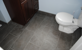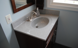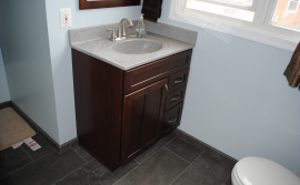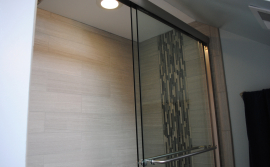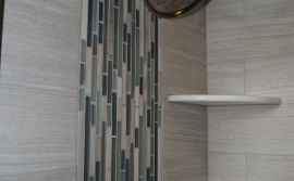 Here is a bathroom remodel we completed in Alexandria. We removed the tub and made it a shower. We added the triangle bench, rain shower head, 6″ x 24″ wall tile with vertical glass tile accent strips, frameless shower doors, cherry vanity and 12″ x 24″ tile on the floor (installed in a staggered pattern).