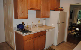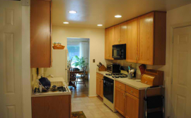 This kitchen remodel is what we can call a one-to-one replacement. We did not change the original layout with the exception of making the wall cabinets 42″ high. The new cabinets are Merrilat Portrait oak cabinets with a cider finish. The new countertop is plastic laminate. We reused the sink and faucet and added recessed lights.